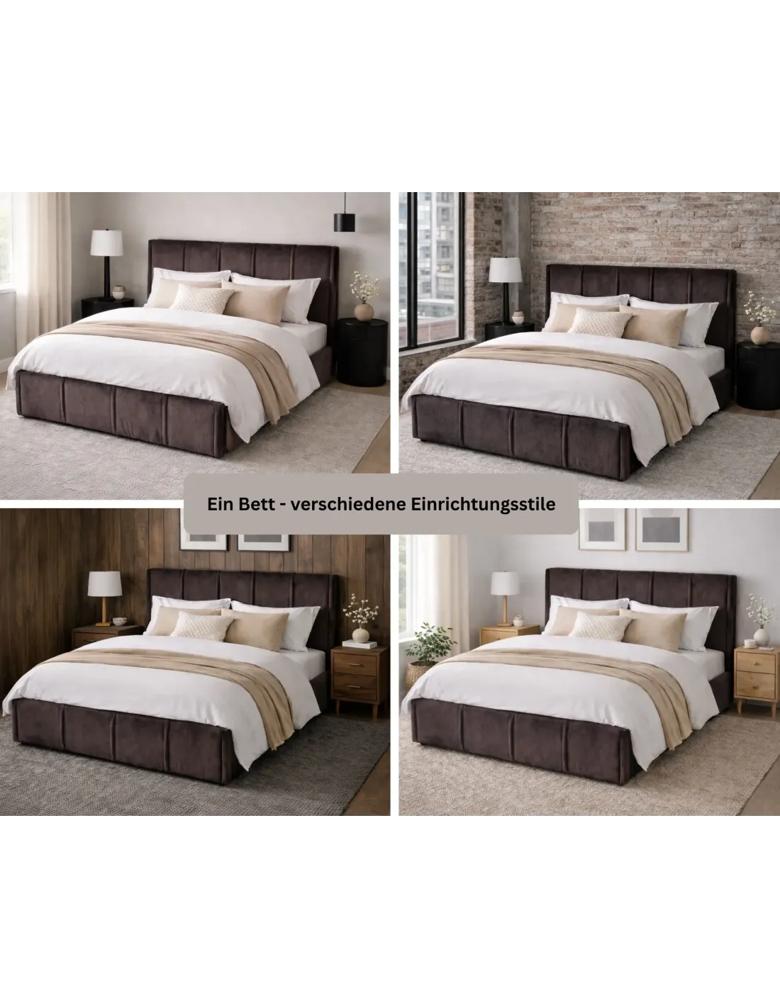 Das Polsterbett Flori bietet Ihnen ein rundum abgestimmtes Schlafsystem, das Komfort, Funktionalität und stilvolle Eleganz vereint. Der besonders weiche Fellimitat-Bezug in edlem Braun sorgt für eine warme, einladende Atmosphäre und verleiht Ihrem Schlafzimmer eine luxuriöse Note.